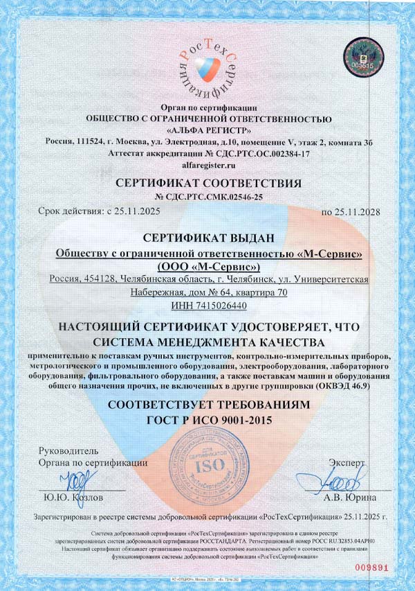 Сообщаем, что система менеджмента качества применительно к поставкам ручных инструментов, контрольно-измерительных приборов, метрологического, лабораторного, промышленного и электрооборудования соответствует требованиям ГОСТ Р ИСО 9001-2015 (ISO 9001:2015).